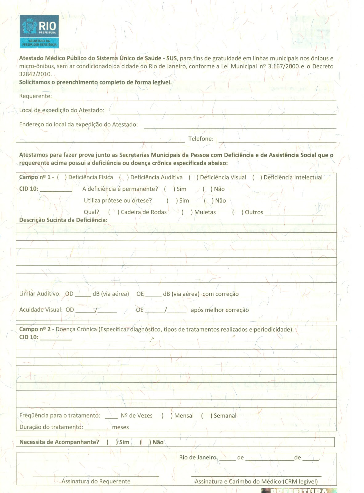 O Formulário de cadastramento deve ser preenchido com o laudo médico de profissional habilitado da rede oficial federal, estadual ou municipal do SUS - Sistema Único de Saúde, contendo o CID-10 (código da Doença);